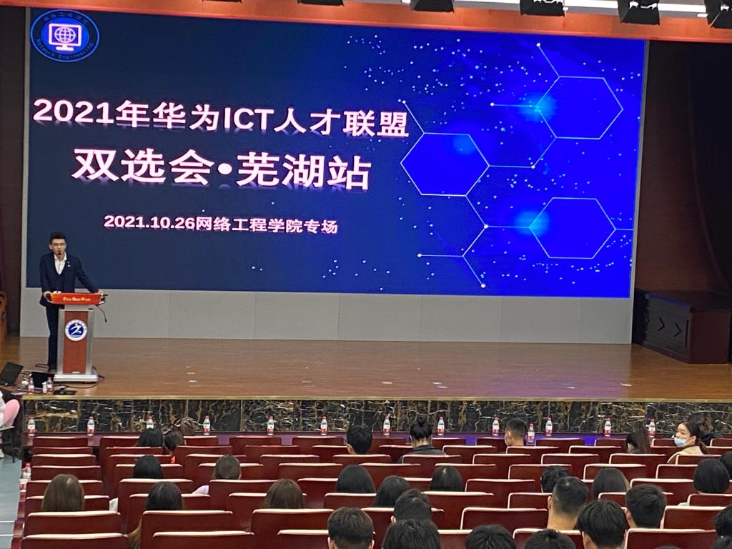为了拓展2019级毕业生的就业选择,进一步做好疫情防控期间毕业生就业工作,为毕业生和用人单位搭建更便捷的交流平台,增强毕业生求职和用人单位招聘的有效性、针对性,10月26日上午,由华为技术有限公司安徽办事处和网络工程学院共同策划的“2021年华为ICT人才联盟双选会·芜湖站-网络工程学院专场”在芜湖职业技术学院南校区学术报告厅成功举办。本次双选会吸引了苏州工业园区凌志软件股份有限公司、芜湖才美文化传媒有限公司、网新科技集团有限公司、哈尔滨联达电气安装有限公司、安徽力瀚科技有限公司、安徽创易科技有限公司等14家华为生态链的优秀合作企业及IT科技类企业进入此次双选会。网络工程学院党总支书记、副书记、部分教师及2019级毕业生参加了招聘会。