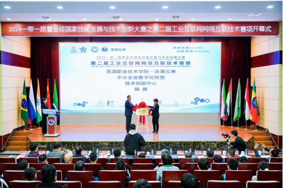 8日下午,在第二届工业互联网网络互联技术比赛开幕式上,学校党委委员、副院长季慕寅与浪潮云洲工业互联网有限公司齐光鹏董事长为“浪潮云洲-芜湖职院校企合作双师型教师培养培训基地(教师企业实践流动站)”共同揭牌,学校副院长刘育红与,浪潮工业互联网股份有限公司长三角中心总经理韩富杰为“浪潮云洲-芜湖职院中小企业数字化转型技术创新中心”共同揭牌。(文/图 张亮亮 审/商建国)