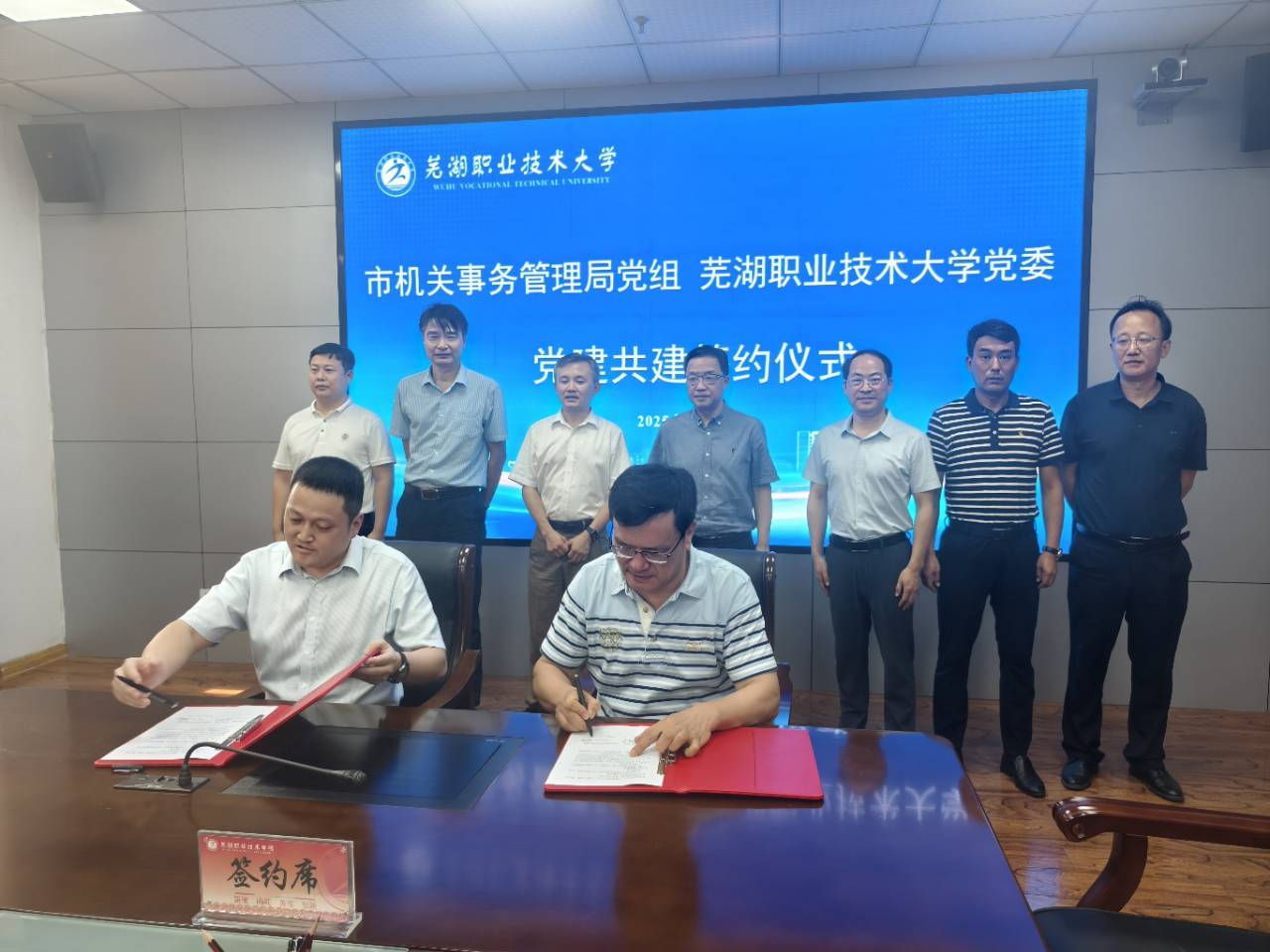 为进一步构建“资源共享、优势互补、合作共赢”的党建工作新格局,实现以共建促党建,以党建促发展的良好局面,7月15日下午,学校与芜湖市机关事务管理局举行党建共建战略合作协议签署仪式。市委副秘书长、市机关事务管理局党组书记、局长王旸,党组成员、副局长王祝明,党组成员、副局长李靖宇,党组成员、副局长郑云卿等,学校党委书记王志鹏,党委副书记袁家和,党委委员、组织部部长李冬生等参加签约活动,签约仪式由李冬生主持。