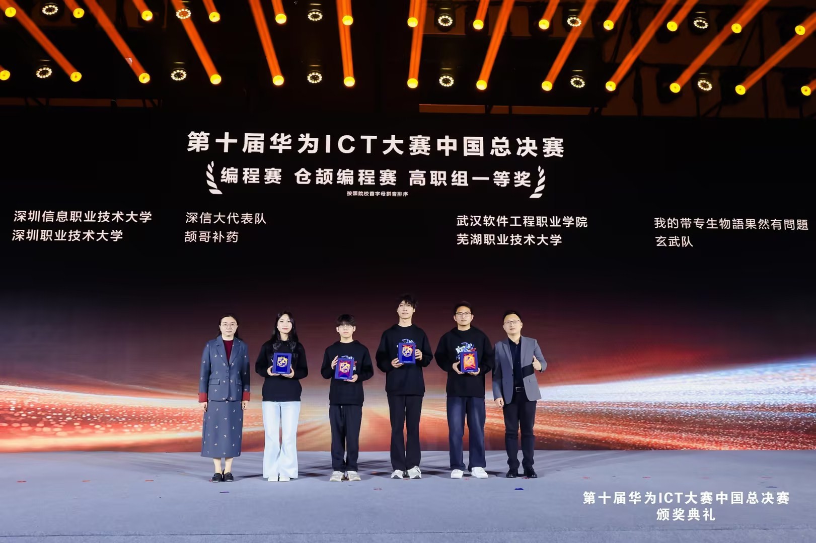 网络工程学院选派大数据技术专业、工业互联网技术专业的学生组成的玄武队,报名参加了编程赛道的比赛。在大数据教研室主任崔婷玉老师精心指导下,师生一行历经初赛、复赛、全国总决赛等环节,最终以优异成绩进入高职组全国前四强,获得该赛道高职组全国一等奖,并取得晋级资格,将代表中国赛区出征6月2日-5日在深圳举行的全球总决赛,与来自世界各地的100余支顶尖队伍同台竞技,展现出芜湖职业技术大学学子的硬核实力与青春风采!(文/陈德林 图/华为 审/商建国)